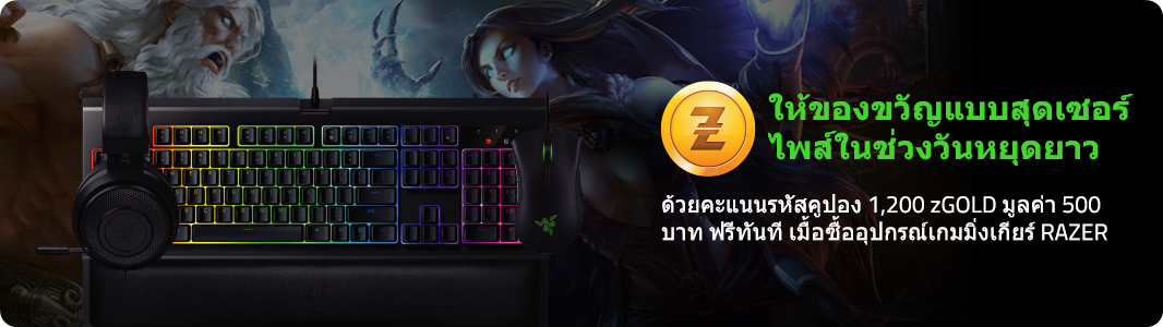 ของขวัญที่เซอร์ไพส์ที่สุด สำหรับเพื่อนคุณด้วยเกมมิ่งเกียร์ Razer และรหัสคูปองคะแนน 1,200 zGold โปรโมชั่นต้อนรับเทศกาลวันหยุดยาว รับรหัสคูปอง zGold 1,200 คะแนน (มูลค่า 500 บาท) เมื่อซื้อสินค้าเกมมิ่งเกียร์ Razer ดังต่อไปนี้