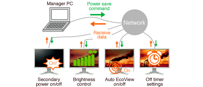EIZO’s EcoView NET power management software provides centralized control over the power settings of monitors on a network. With EcoView NET, a systems administrator can confirm the settings for each monitor on the network, turn the power on or off, and if necessary, take measures to combat eye fatigue such as adjust the brightness or activate Auto EcoView. EcoView NET is available from EIZO distributors.