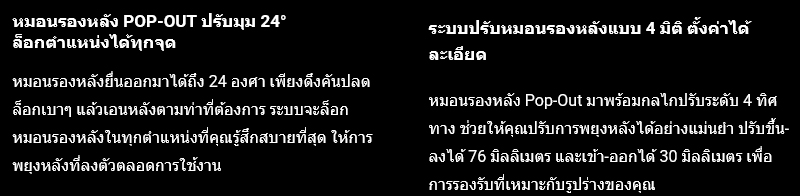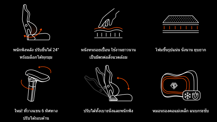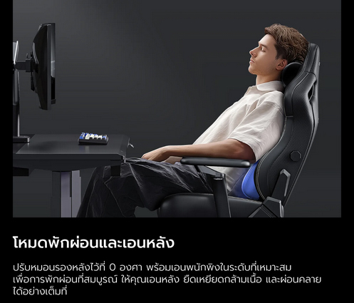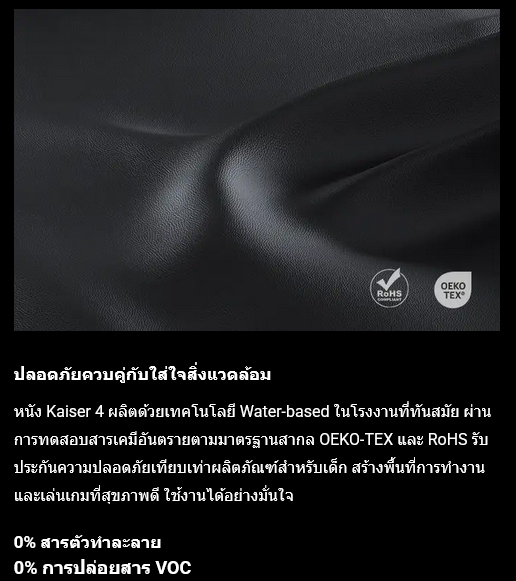 เอนพนักพิงได้ 135 องศา นั่งเอนและผ่อนคลายได้ตามใจคุณ ด้วยโครงสร้างแข็งแรงและฐานล้ออะลูมิเนียม Kaiser 4 พร้อมซัพพอร์ตหลังคุณเสมอ | โหมดโยก 15 องศา โยกตัวผ่อนคลายได้สุด ด้วยกลไกเอน-โยก ให้การโยกนุ่มนวล รองรับน้ำหนักได้สูงสุดถึง 120 กิโลกรัม | ปรับความสูงได้ 6.5 เซนติเมตร มาพร้อมโช้คมาตรฐาน SGS Class 4 ปรับความสูงได้อย่างนุ่มนวลและแม่นยำ เหมาะกับผู้ใช้งานสูง 150-210 เซนติเมตร |