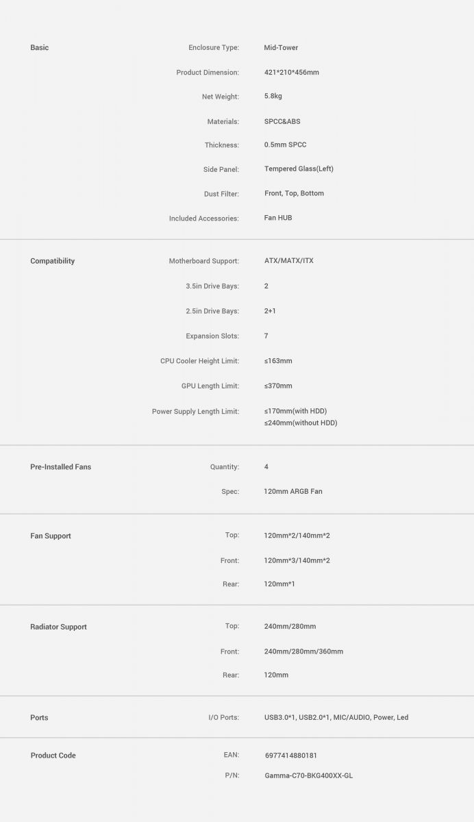 (จองล่วงหน้า) เคสดีไซน์เรียบหรู พร้อมตาข่ายด้านหน้าเพื่อการระบายอากาศที่ยอดเยี่ยม รองรับชุดน้ำ 360 มม. และ ARGB เต็มรูปแบบ ประกอบง่าย จัดสายได้เป็นระเบียบ ตอบโจทย์ ATX/M-ATX/ITX และชุดประกอบประสิทธิภาพสูง (GAMMA-C70-WHG400XX-GL)