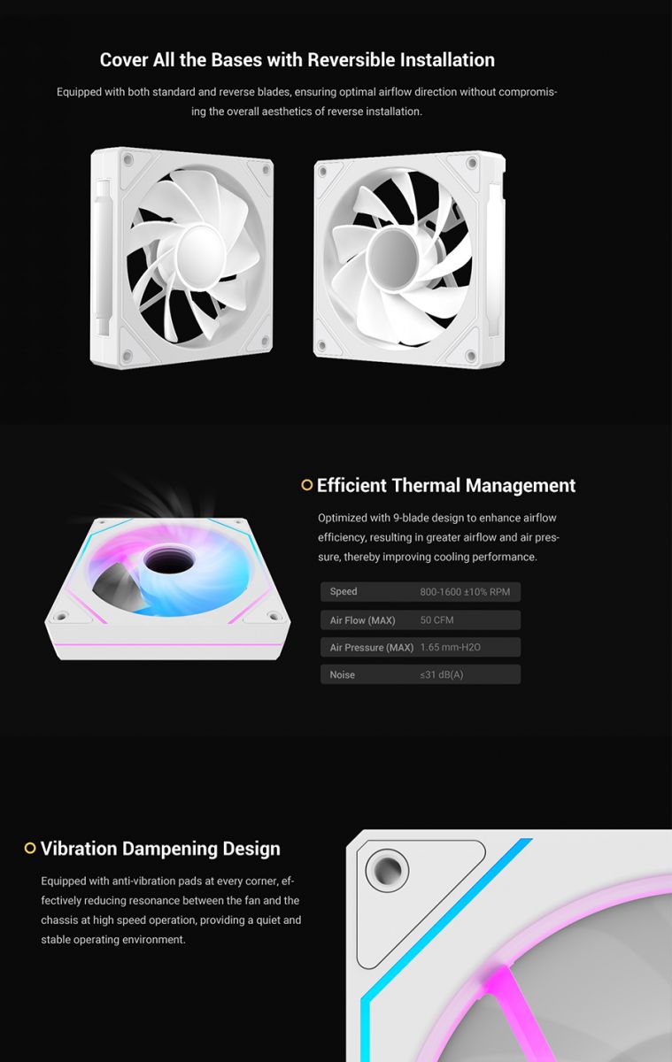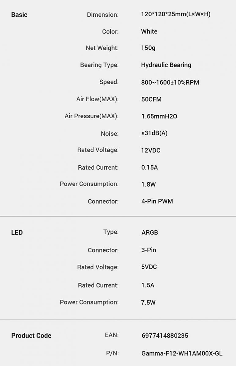 (จองล่วงหน้า) พัดลมระบายความร้อน 120mm ไฟ ARGB, PWM ควบคุมอัตโนมัติ เสียงเงียบ 31dB ลมแรง 50 CFM ลูกปืน Hydraulic (GAMMA-F12-WH1AM00X-GL)