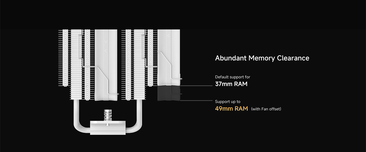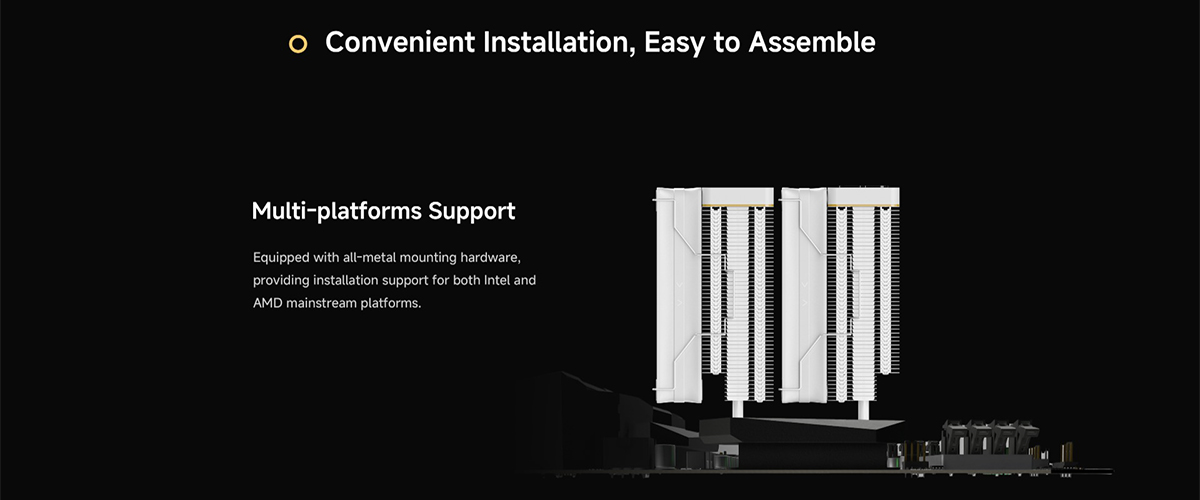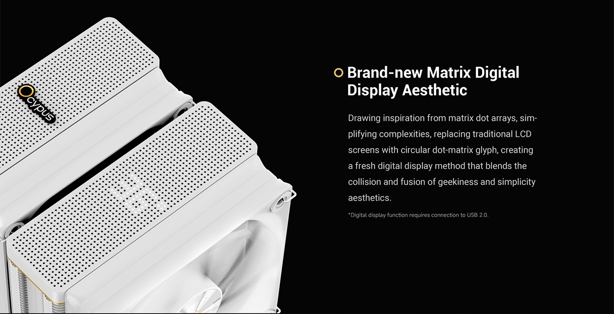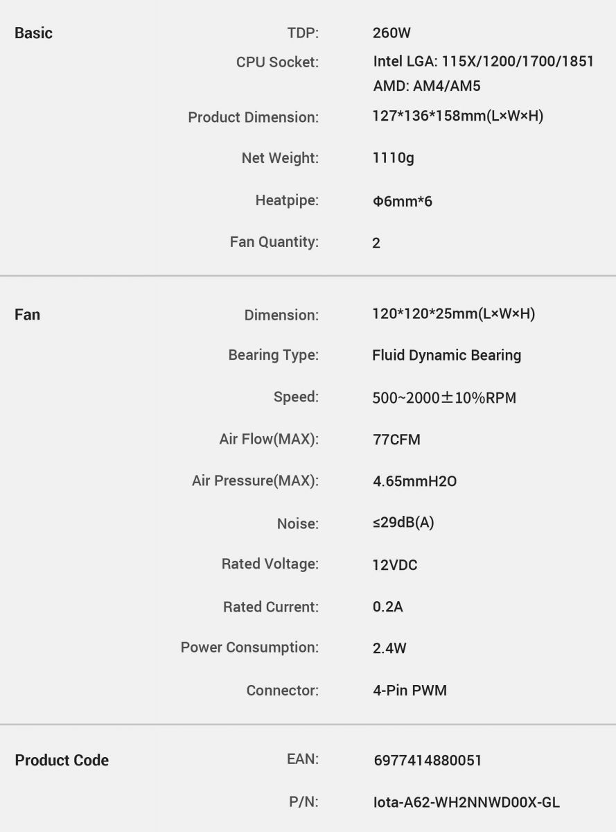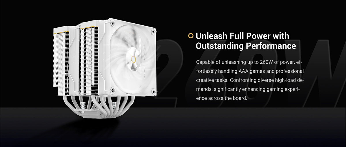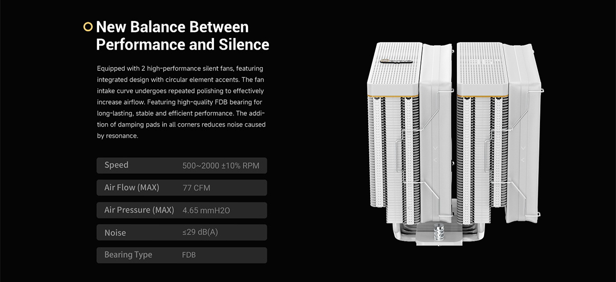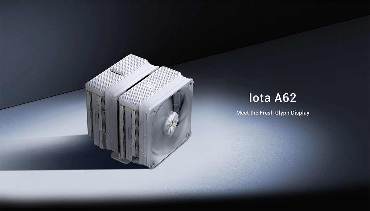 (จองล่วงหน้า) ระบบ Air Cooler คู่ TDP 260W ดีไซน์ Dual Tower แสดงผลอุณหภูมิด้วย Digital Matrix และใช้พัดลม Fluid Dynamic Bearing เสียงสูงสุด 29 dB(A) (IOTA-A62-WH2NNWD00X-GL)