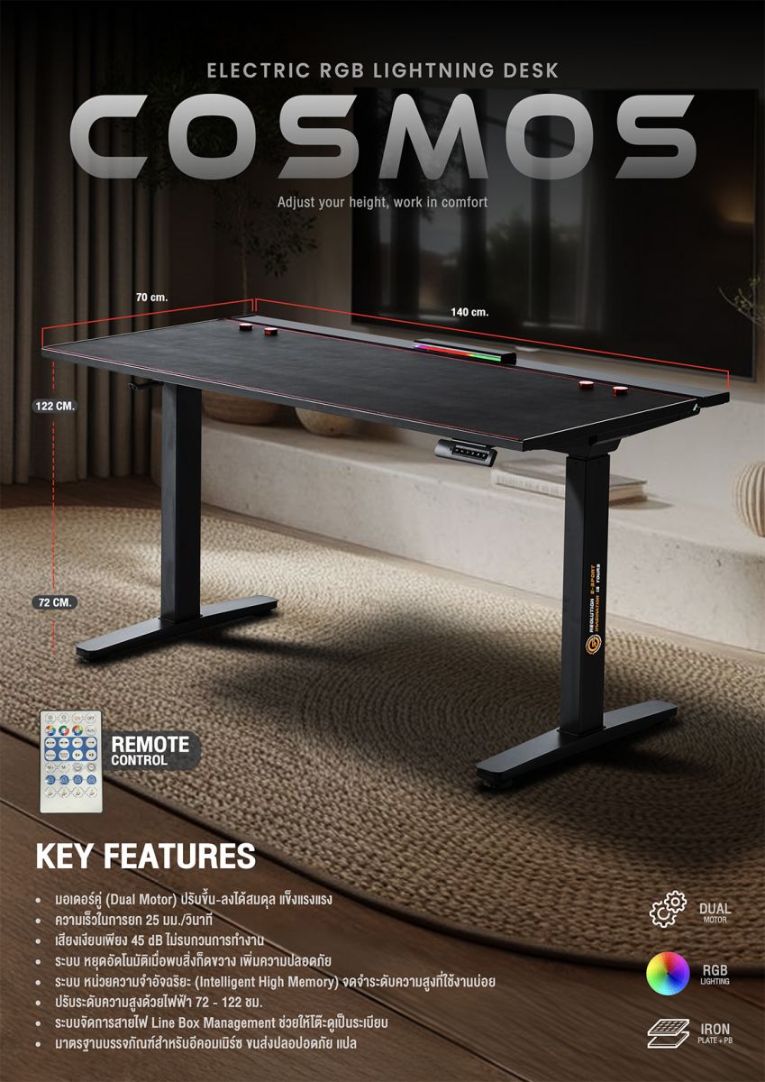Neolution E-Sport Cosmos โต๊ะเกมมิ่งระบบปรับระดับไฟฟ้ามอเตอร์คู่ (Dual Motor) ที่ออกแบบมาเพื่อความสมดุลและความแข็งแรงสูงสุด ปรับระดับความสูงได้ลื่นไหลและเงียบสนิท พร้อมระบบไฟ RGB อัจฉริยะที่สามารถวิ่งตามจังหวะเพลง ช่วยสร้างบรรยากาศการเล่นเกมให้เหนือชั้นกว่าที่เคย