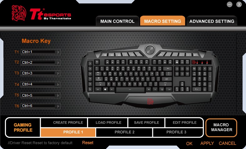 ด้านซ้ายจะพบกับปุ่มเปลี่ยนโปรไฟล 1-2-3 สามโปรไฟล์ โปรไฟล์ละ6มาโครรวมเป็น18มาโคร