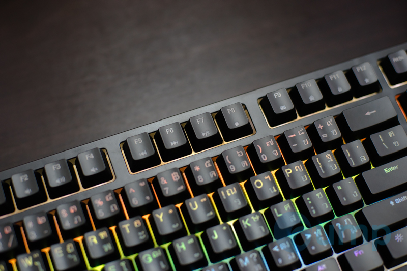 มีไฟ Led แบบ Rainbow จะมีไฟแต่ล่ะสี ในแต่ล่ะแถวไม่เหมือนกันปรับความสว่างไฟได้ 3 ระดับ กด [ FN+PgUP] ปรับไฟลง กด [FN+PgDn]